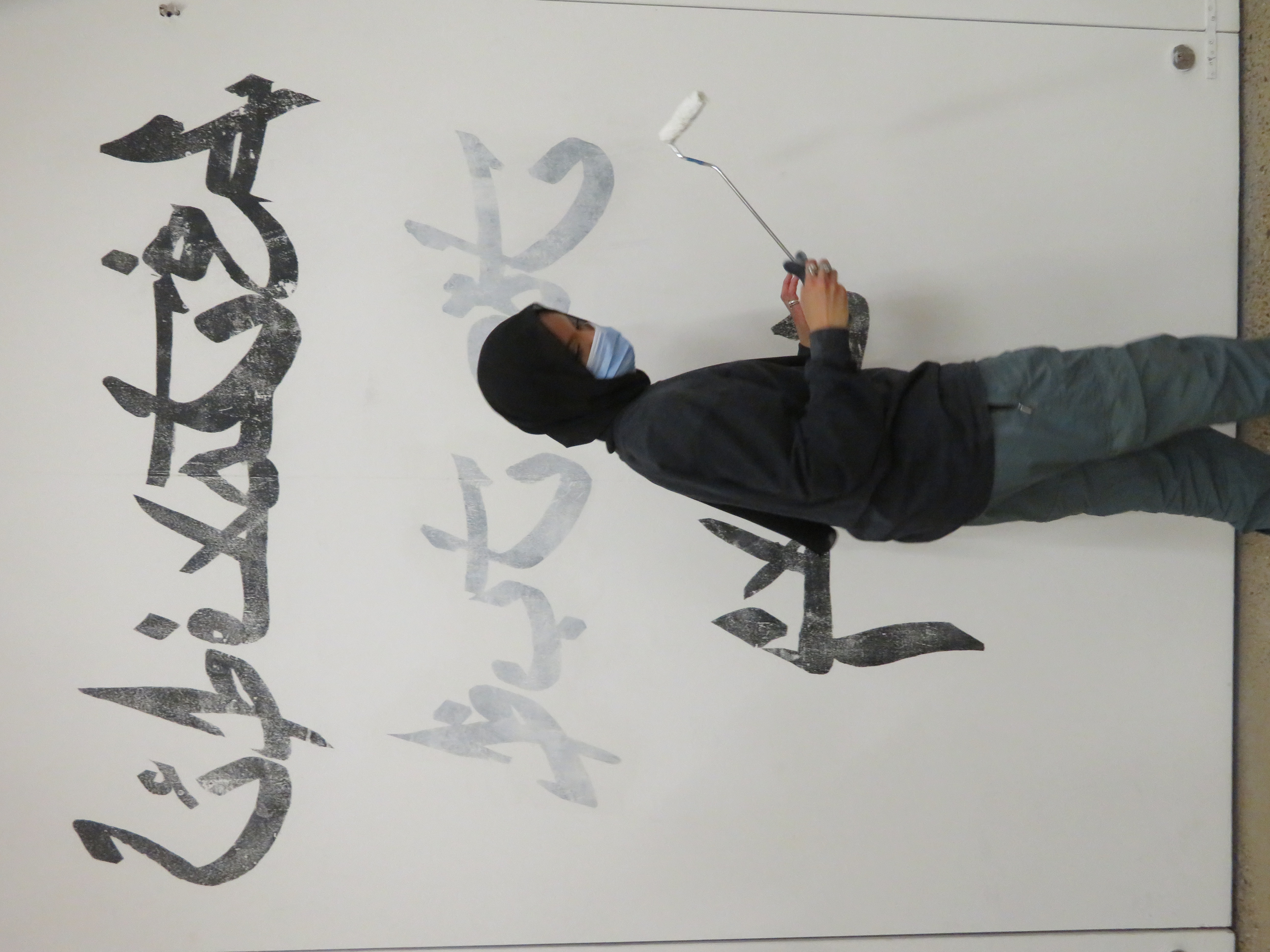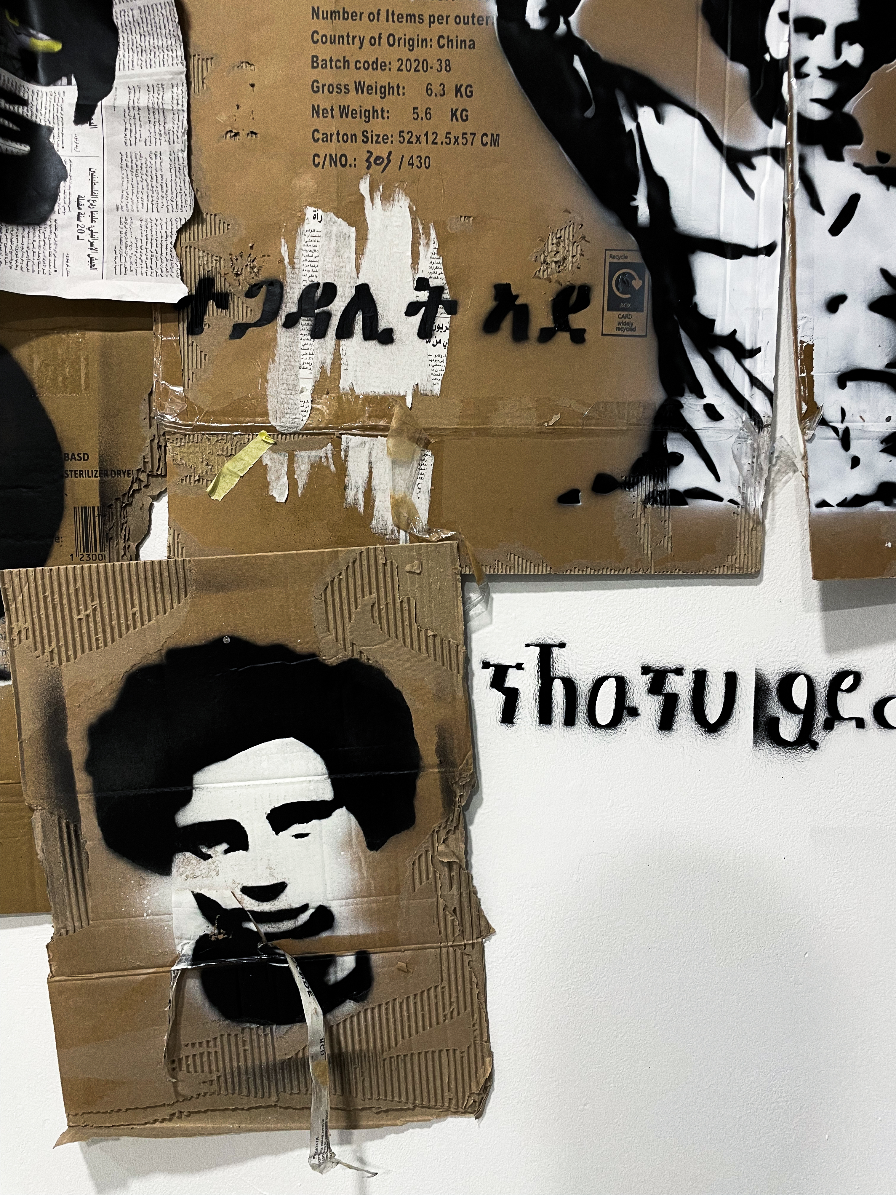 Performance (2022)Inspired by the ex-fighters I created stencils of the Eritrean women figher silhouettes using reused cardboard to symbolise their marginalized status. I designed a new language merging Arabic and English to write "Liberated but not free" on walls and cardboard using stencils, a paint roller, and sandpaper. This language amplifies the voices of marginalized Eritrean women, serving as a secret code of communication and resistance. The intentional removal of my artwork during the performance pays tribute to graffiti rituals and symbolizes suppressed conversations.